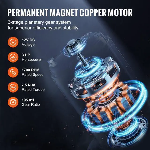 Waterproof Rating: IP55,Remote Control: Wireless + Wired Remote Control,Rope Material: Polyethylene, 12 Strands,Item Model Number: S10000,Voltage/Horsepower: 12V DC/3 HP,Gear Ratio: 195.8:1,Item Dimensions: 21.1 x 6.3 x 8.6 in/53.7 x 16 x 21.8 cm,Rated Line Pull Capacity: 10000 lbs/4536 kg,Rope Specifications: 7/20 in x 65 ft/0.9 x 1981.2 cm,Net Weight: 45.0 lbs/20.4 kg,Main Material: Alloy Aluminum, Steel, Copper, Plastic (PPS and PA, etc.),Wireless Remote Control Distance: 65.61 ft/20 m