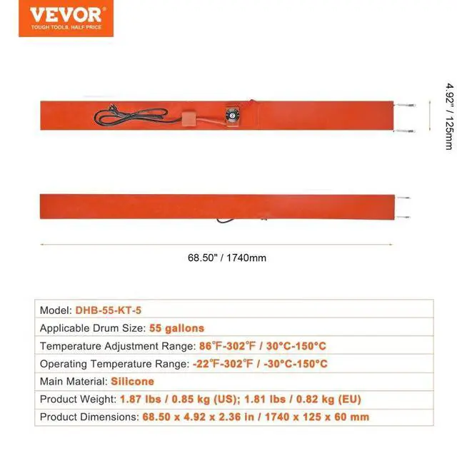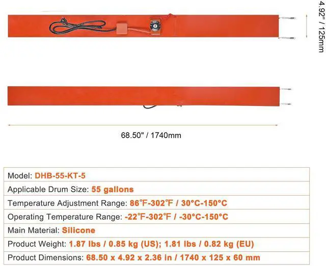 Temperature Adjustment Range: 86-302 / 30°C-150°C,Operating Temperature Range: -22-302 / -30°C-150°C,Model: DHB-55-KT-5,Product Weight: 1.87 lbs / 0.85 kg,Applicable Drum Size: 55 gallons,Product Dimensions: 68.50 x 4.92 x 2.36 in / 1740 x 125 x 60 mm,Main Material: Silicone