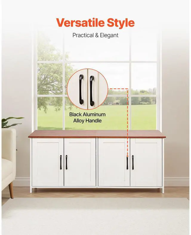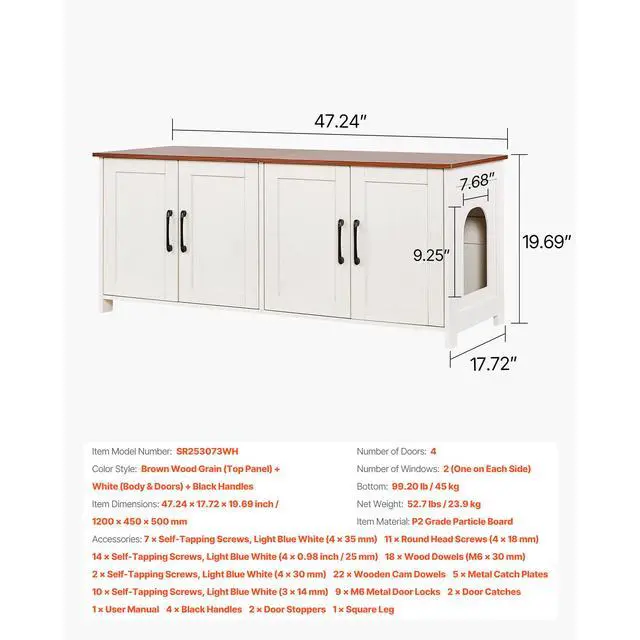 Bottom Weight Capacity: 100 lbs/45 kg,Color: White,Item Model Number: KLCB-02,Product Weight: 42.7lbs/19.4kg,Number of Doors: 4,Top Weight Capacity: 150 lbs/68 kg,Number of Windows: 2,Main Material: 12mm Particle Board,Product Size: 47.2 x 18.5 x 19.7in/1.19×0.46×0.5m