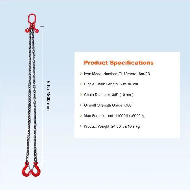 Single Chain Length: 6 ft/180 cm,Item Model Number: DL10mmx1.8m-2B,Product Weight: 24.03 lbs/10.9 kg,Max Secure Load: 11000 lbs/5000 kg,Chain Diameter: 3/8" (10 mm),Overall Strength Grade: G80