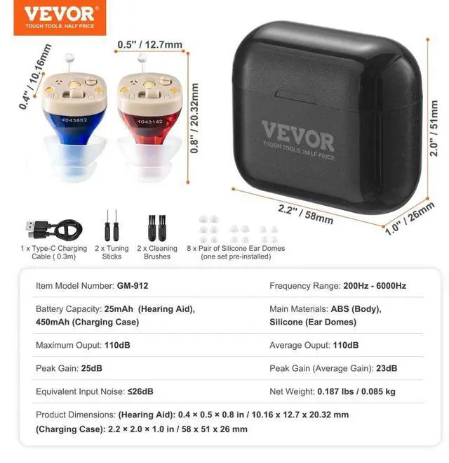 Battery Capacity: 25mAh (Hearing Aid), 450mAh (Charging Case),Main Materials: ABS (Body), Silicone (Ear Domes),Item Model Number: GM-912,Net Weight: 0.187 lbs / 0.085 kg,Hearing Aid Size: 0.4 x 0.5 x 0.8 in / 10.16 x 12.7 x 20.32 mm,Charging Cas Size: 2.2 x 2.0 x 1.0 in / 58 x 51 x 26 mm