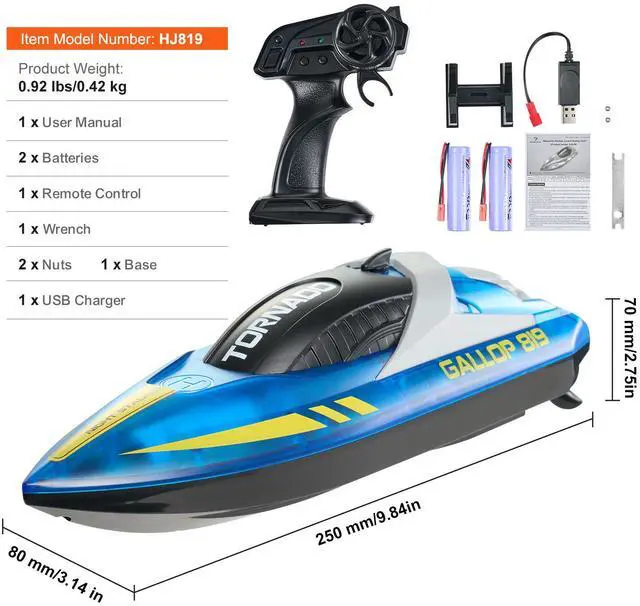 Package Content 1 x RC Boat 1 x Remote Control 2 x Batteries 1 x Base 1 x USB Charger 1 x Wrench 2 x Nuts 1 x User Manual