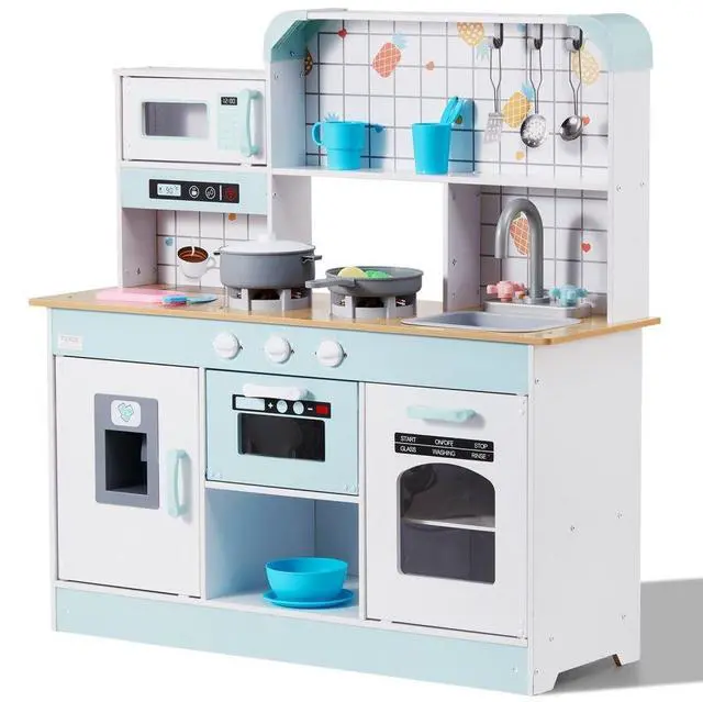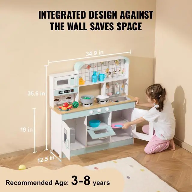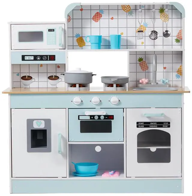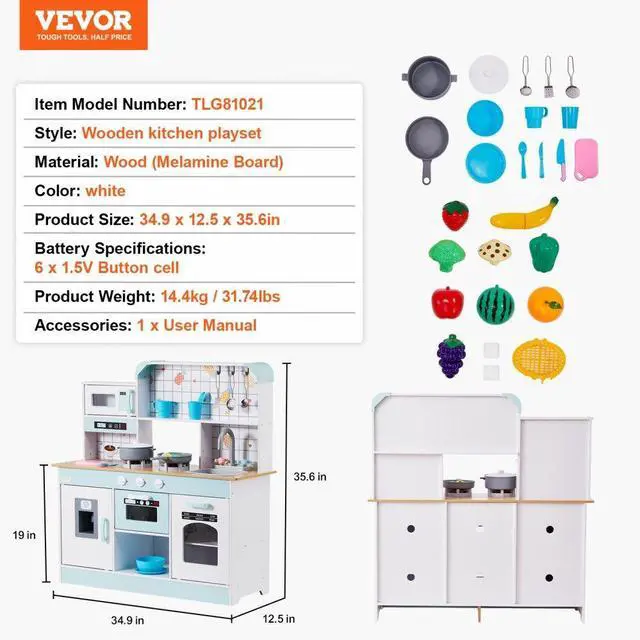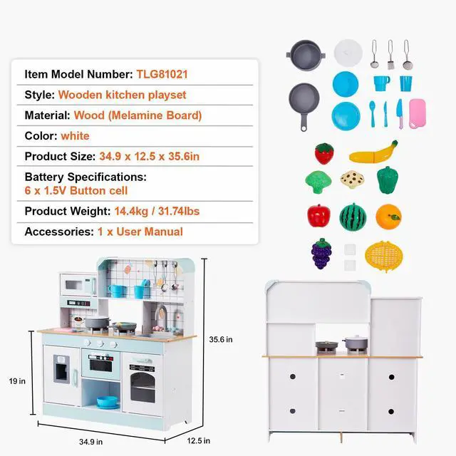 Color: White,Item Model Number: TLG81021,Product Weight: 31.7 lbs/14.4 kg,Style: Integrated Design,Realistic Kitchenware and Food: 24 PCS,Material: Wood (Melamine Board),Battery Specifications: 6 x 1.5V Button Batteries,Product Size: 34.9 x 12.5 x 35.6 in/88.6 x 31.7 x 90.4 cm