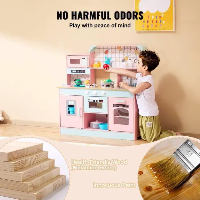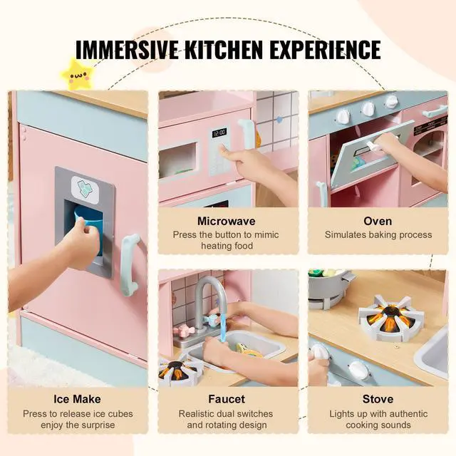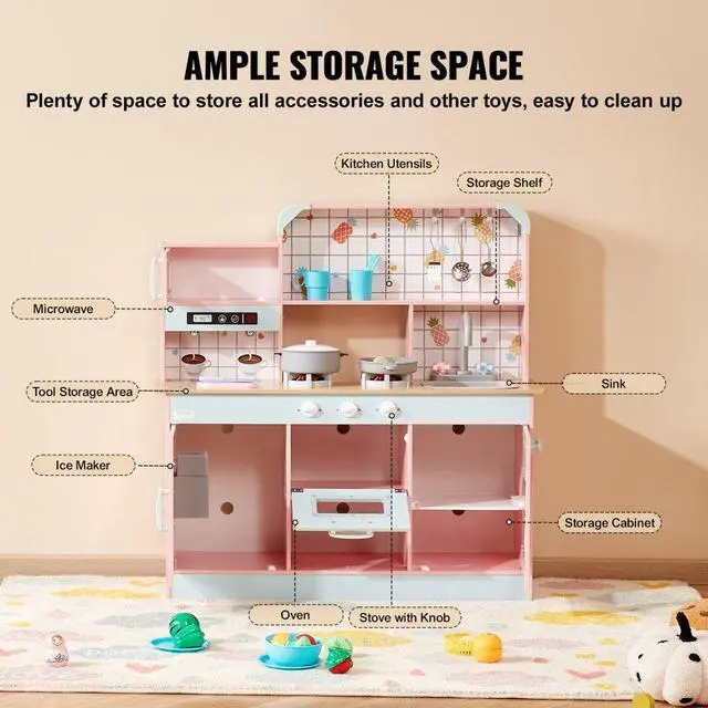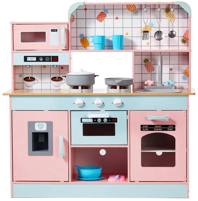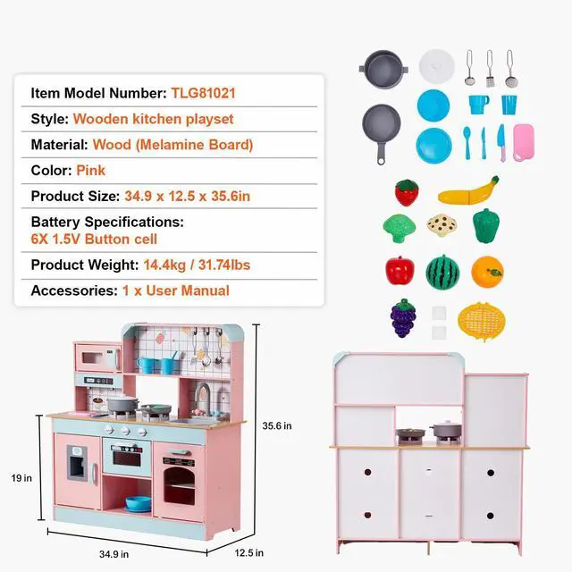Color: Pink,Item Model Number: TLG81021,Product Weight: 31.7 lbs/14.4 kg,Style: Integrated Design,Realistic Kitchenware and Food: 24 PCS,Material: Wood (Melamine Board),Battery Specifications: 6 x 1.5V Button Batteries,Product Size: 34.9 x 12.5 x 35.6 in/88.6 x 31.7 x 90.4 cm