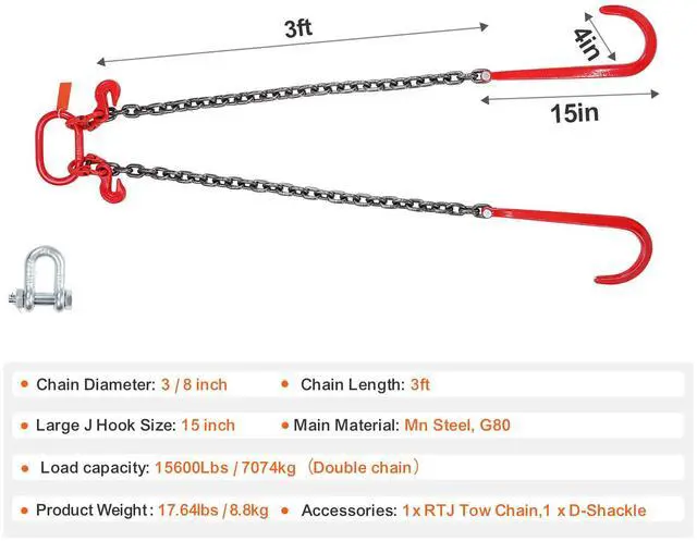 Load Capacity: 15600 lbs/7074 kg,Single Chain Length: 3 ft/90 cm,Item Model Number: RTJ3/8*3FT-A1,Product Weight: 17.64 lbs/8.8 kg,Material: Mn Steel, G80,Chain Diameter: 3/8" (10 mm)
