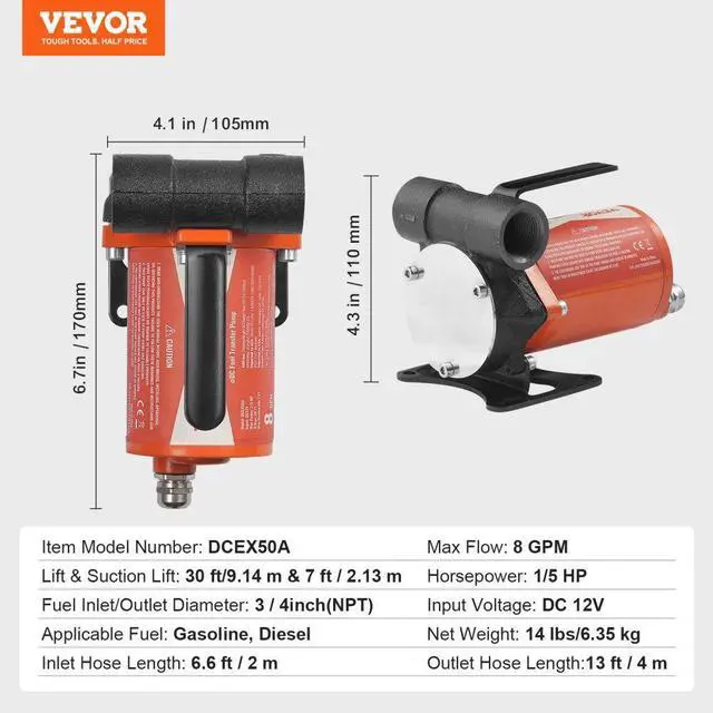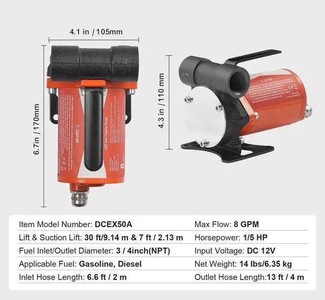 Applicable Fuel: Gasoline, Diesel,Outlet Hose Length: 13 ft/4 m,Horsepower: 1/5 HP,Item Model Number: DCEX50A,Max Flow: 8 GPM,Input Voltage: DC 12V,Lift & Suction Lift: 30 ft/9.14 m & 7 ft/2.13 m,Fuel Inlet/Outlet Diameter: NTP3/4,Net Weight: 14 lbs/6.35 kg,Inlet Hose Length: 6.6 ft/2 m