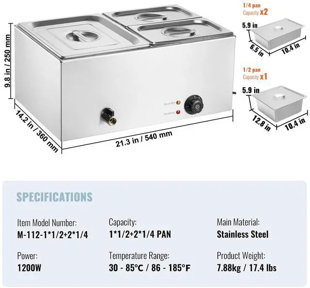 Capacity: 16 L / 17 qt,Item Model Number: M-112,Product Weight: 7.88 kg / 17.4 lbs,Temperature Range: 86-185°F / 30-85°C,Power: 1200W,Main Material: Stainless Steel,Product Size: 540 x 360 x 250 mm / 21.3 x 14.2 x 9.8 in