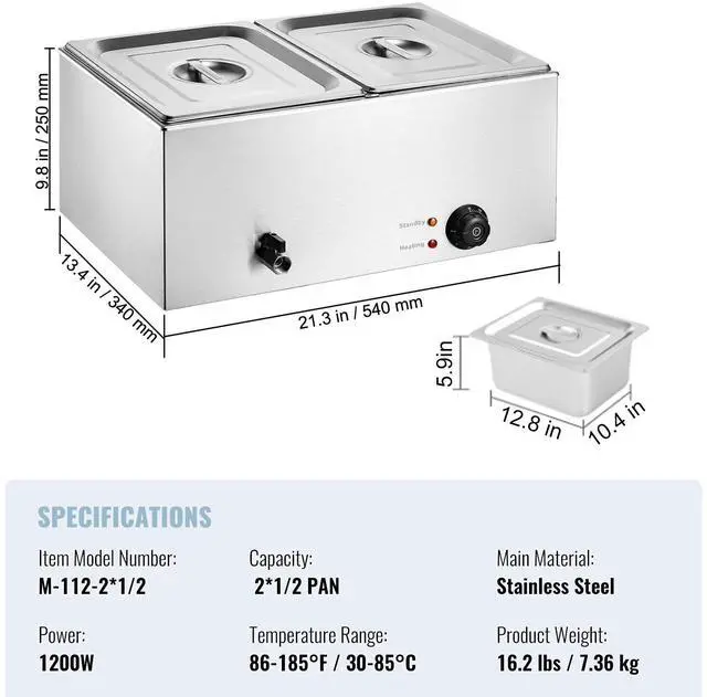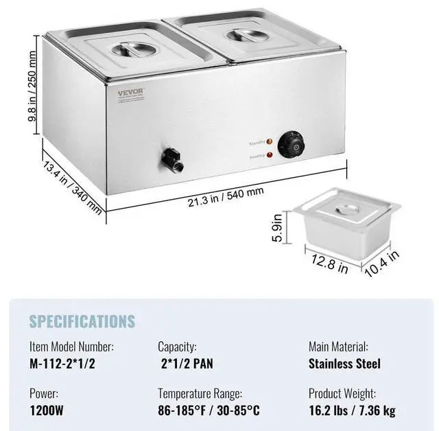 Capacity: 17 L / 18 qt,Item Model Number: M-112,Product Weight: 7.36 kg / 16.2 lbs,Temperature Range: 86-185°F / 30-85°C,Power: 1200W,Main Material: Stainless Steel,Product Size: 540 x 340 x 250 mm / 21.3 x 13.4 x 9.8 in