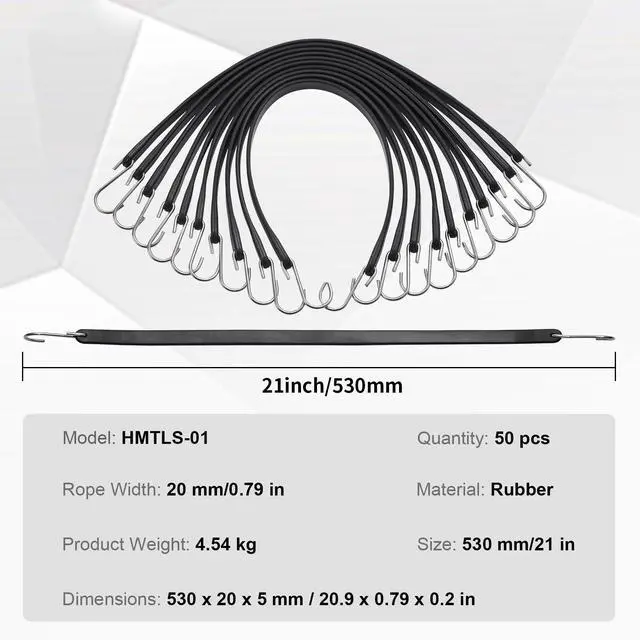Model: HMTLS-01 Lengths: 21 ±1 in / 0.53 m Round Diameter / Flat Width: 31.5 cm ( 1.6 x) Quantity: 50 pcs Material: Rubber Surface Treatment: Smooth Maximum Load: 300 N Hook Type: S-Hook Hook Material: Steel Hook Diameter: 4 mm Hook Width: 25 mm Product Dimensions: 53 x 2 x 0.5 cm Product Weight: 4.54 kg