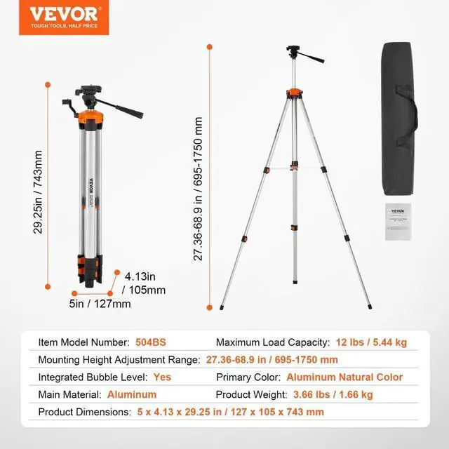 • VEVOR Laser Level Tripod ¼ x 20 Thread 27.36-68.11 inch Height Adjustment