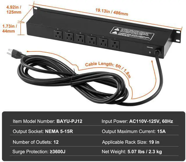 Output Maximum Current: 15A,Surge Protection: 3600J,Input Power: AC110V-125V, 60Hz,Output Socket: NEMA 5-15R,Item Model Number: BAYU-PJ12,Number of Outlets: 12,Applicable Rack Size: 19 in,Net Weight: 5.07 lbs / 2.3 kg