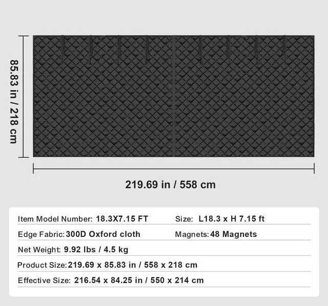 Size: L 18.3 x H 7.15 ft,Item Model Number: 18.3X7.15 FT,Edge Fabric: 300D Oxford Fabric,Magnets: 48 Magnets,Net Weight: 9.92 lbs / 4.5 kg,Product Size: 18.3 x 7.15 ft / 558 x 218 cm,Effective Size: 18.04 x 7.02 ft / 550 x 214 cm