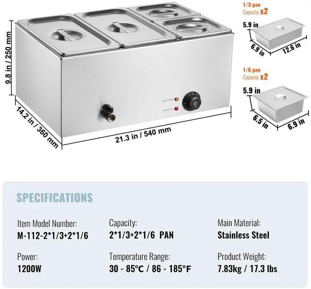 Capacity: 15.5L / 16.4 qt,Item Model Number: M-112,Product Weight: 7.83 kg / 17.3 lbs,Temperature Range: 86-185°F / 30-85°C,Power: 1200W,Main Material: Stainless Steel,Product Size: 540 x 360 x 250 mm / 21.3 x 14.2 x 9.8 in