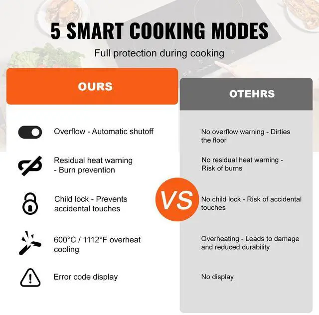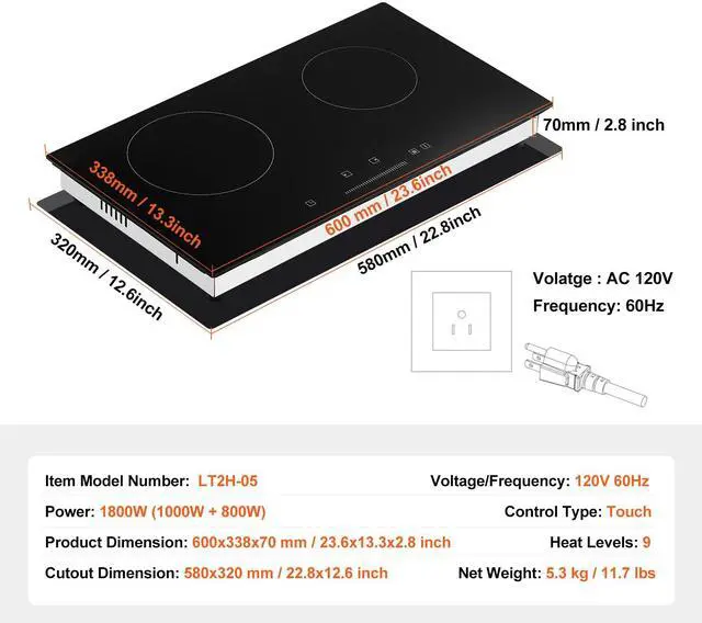 Voltage/Frequency: 120V 60Hz,Cutout Dimension: 580x320 mm / 22.8x12.6 inch,Product Dimension: 600x338x70 mm / 23.6x13.3x2.8 inch,Control Type: Touch,Item Model Number: LT2H-05,Net Weight: 5.3 kg / 11.7 lbs,Power: 1800W (1000W + 800W),Heat Levels: 9