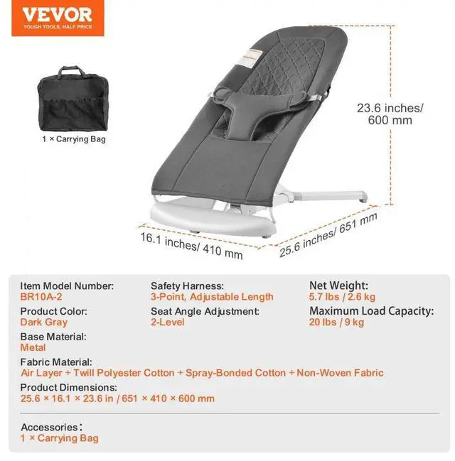 Safety Harness: 3-Point, Adjustable Length,Seat Angle Adjustment: 2-Level,Product Color: Dark Gray,Item Model Number: BR10-A,Maximum Load Capacity: 20 lbs / 9 kg,Product Dimensions: 25.6 x 16.1 x 23.6 in / 651 × 410 × 600 mm,Net Weight: 5.7 lbs / 2.6 kg,Base Material: Metal
