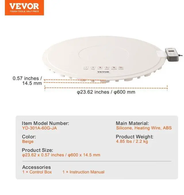 Color: Beige,Item Model Number: YD-301A-60G-JA,Product Weight: 4.85 lbs / 2.2 kg,Main Material: Silicone, Heating Wire, ABS,Product Size: 23.62" x 0.57" / 600mm x 14.5 mm