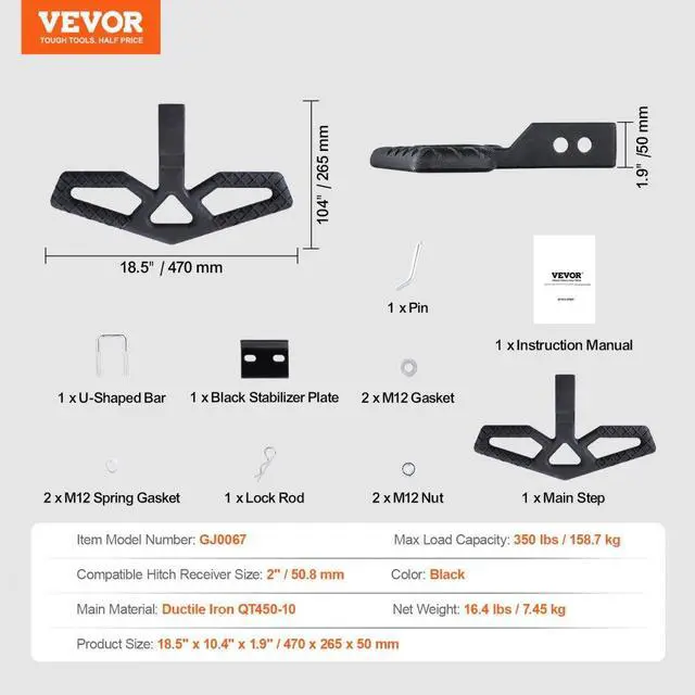 Length: 18.5 in / 470 mm,Color: Black,Item Model Number: GJ0067,Max Load Capacity: 350 lbs / 158.7 kg,Compatible Hitch Receiver Size: 2" / 50.8 mm,Net Weight: 16.4 lbs / 7.45 kg,Main Material: Ductile Iron QT450-10,Product Size: 18.5" x 10.4" x 1.9" / 470 x 265 x 50 mm