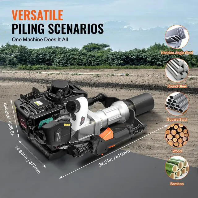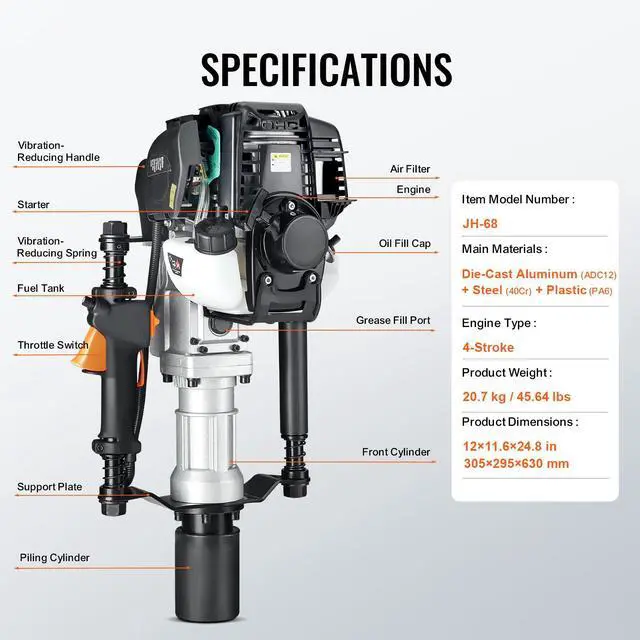 Maximum Torque: 1.6 N·m,Impact Energy: 20-50J,Maximum Torque Speed: 6000 RPM,Product Dimensions: 615 x 377 x 480 mm / 24.21 x 14.84 x 18.90 in,Displacement: 37.7cc,Engine Type: 4-Stroke,Main Materials: Die-cast Aluminum + Steel+ Plastic,Rated Speed: 6500 RPM,Included Piling Sleeve Diameters: 55mm, 70mm,Item Model Number: JH-68,Fuel Tank Capacity: 0.65L ±5%,Rated Power: 1kW ±5%,Impact Frequency: 2400-3000 BPM,Net Weight: 20.7 kg / 45.64 lbs