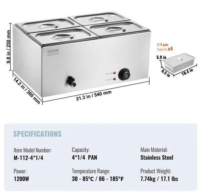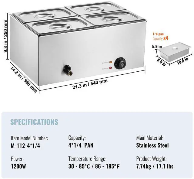 Capacity: 15L / 15.9 qt,Item Model Number: M-112,Product Weight: 7.74 kg / 17.1 lbs,Temperature Range: 86-185°F / 30-85°C,Power: 1200W,Main Material: Stainless Steel,Product Size: 540 x 360 x 250 mm / 21.3 x 14.2 x 9.8 in