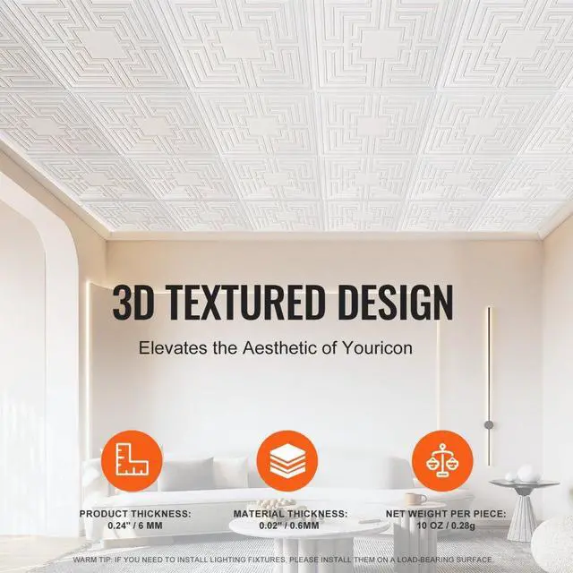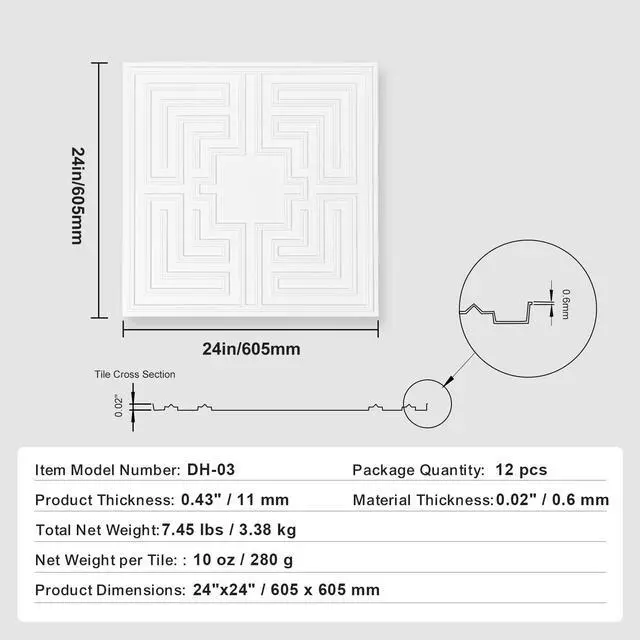 Total Net Weight: 7.45 lbs / 3.38 kg,Color: White,Item Model Number: DH-03,Net Weight per Tile: 10 oz / 280 g,Package Quantity: 12 pcs,Product Thickness: 0.43" / 11 mm,Product Dimensions: 24" x 24" / 605 mm x 605 mm,Material Thickness: 0.02" / 0.6 mm,Main Material: PVC