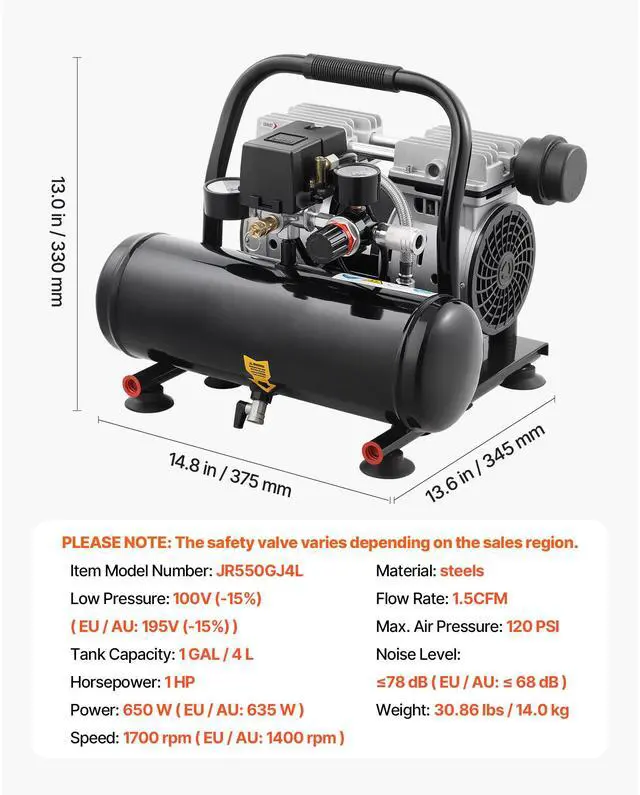 Noise Level: 78dB,Speed: 1700rpm,Flow Rate: 1.5CFM,Tank Capacity: 1 GAL / 4L,Pressure Flow Rate: 0.040m³/min(90psi),Max. Air Pressure: 120PSI,Item Size: 14.8x13.6x13.0 inch / 375x345x330mm,Horsepower: 1HP,Item Model Number: JR550GJ4L,Material: Steel,Power: 650W,Item Weight: 30.86 lbs / 14.0 kg