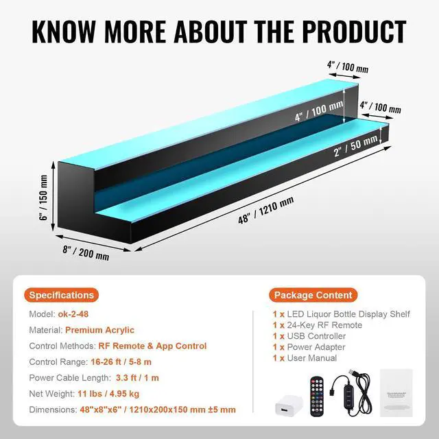 Power Cable Length: 3.3 ft / 1 m,Item Model Number: ok-2-48,Dimensions: 48"x8"x6" / 1210x200x150 mm ±5 mm,Material: Premium Acrylic,Control Methods: RF Remote & App Control,Control Range: 16-26 ft / 5-8 m,Net Weight: 11 lbs / 4.95 kg
