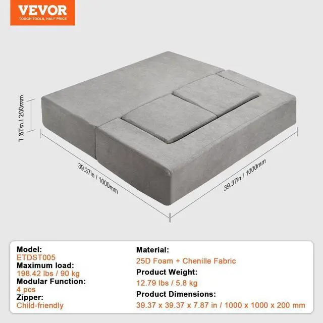 Maximum Load: 198.42 lbs/90 kg,Modular Function: 4 pcs,Foam: 39.37 x 19.69 x 7.87 in/1000 x 500 x 200 mm (2 pcs),Model: ETDST005,Product Weight: 12.79 lbs/5.8 kg,Material: 25D Foam + Chenille Fabric,Zipper: Child-friendly,Product Dimensions: 39.37 x 39.37 x 7.87 in/1000 x 1000 x 200 mm,13.78 x 13.78 x 7.87 in/350 x 350 x 200 mm (2 pcs):