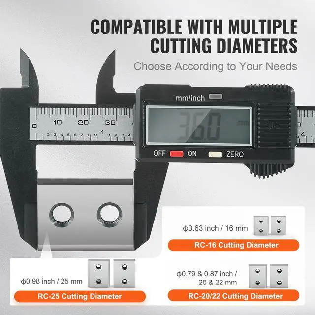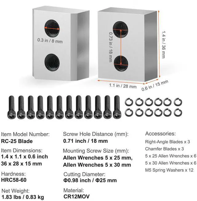 Item Model Number: RC-25 Blade,Mounting Screw Size (mm): Allen Wrenches 5 x 25 mm, Allen Wrenches 5 x 30 mm,Item Dimensions: 1.4 x 1.1 x 0.6 inch / 36 x 28 x 15 mm,Material: CR12MOV,Hardness: HRC58-60,Net Weight: 1.83 lbs / 0.83 kg,Screw Hole Distance (mm): 0.71 inch / 18 mm,Cutting Diameter: 0.98 inch / 25 mm