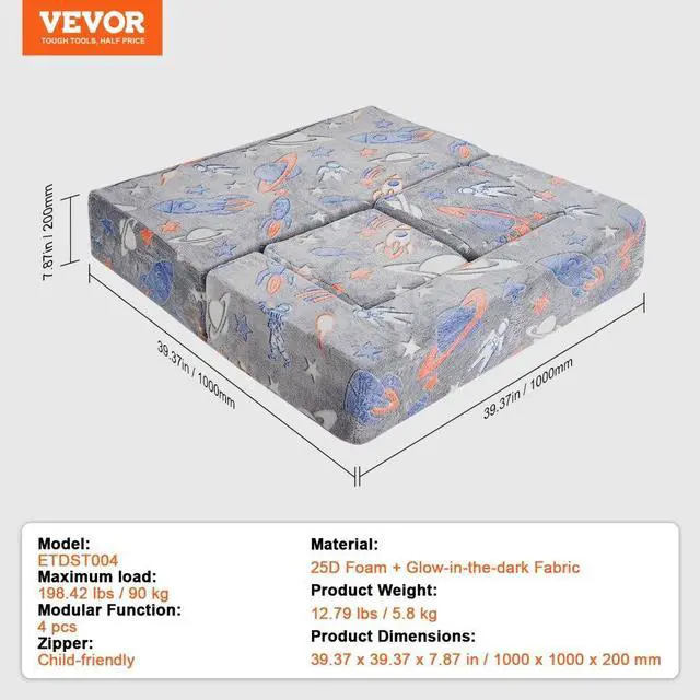 Maximum Load: 198.42 lbs/90 kg,Modular Function: 4 pcs,Foam: 39.37 x 19.69 x 7.87 in/1000 x 500 x 200 mm (2 pcs),Model: ETDST004,Product Weight: 12.79 lbs/5.8 kg,Material: 25D Foam + Glow-in-the-dark Fabric,Zipper: Child-friendly,Product Dimensions: 39.37 x 39.37 x 7.87 in/1000 x 1000 x 200 mm,13.78 x 13.78 x 7.87 in/350 x 350 x 200 mm (2 pcs):