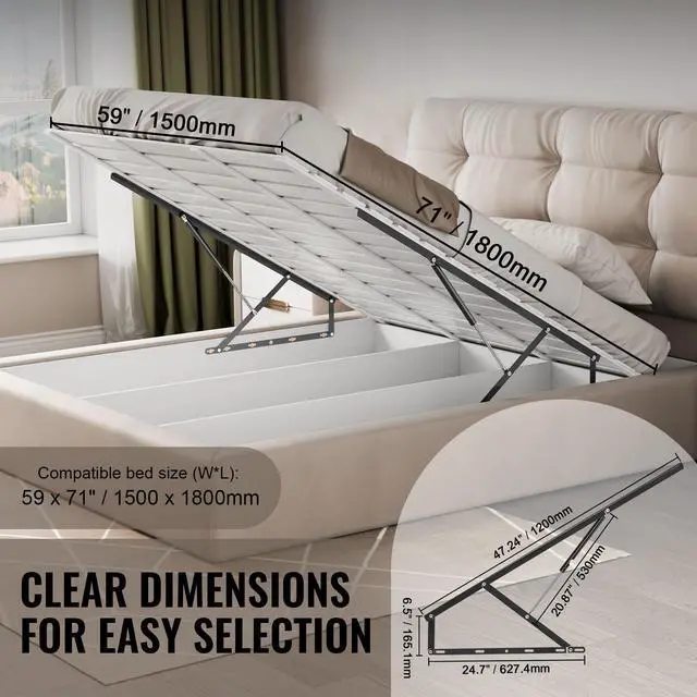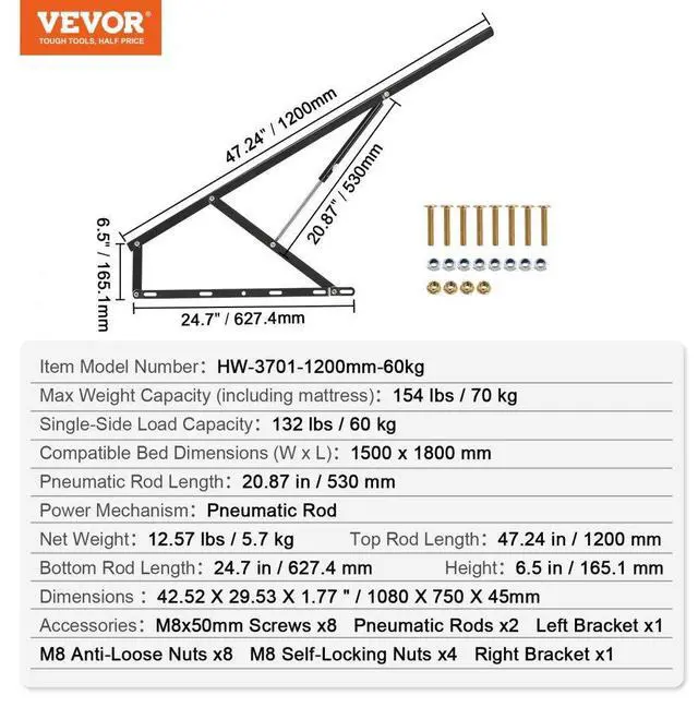 VEVOR Bed Lift 59x71 in Compatible Bed Size 154 lbs Load DIY Wall Bed Hardware