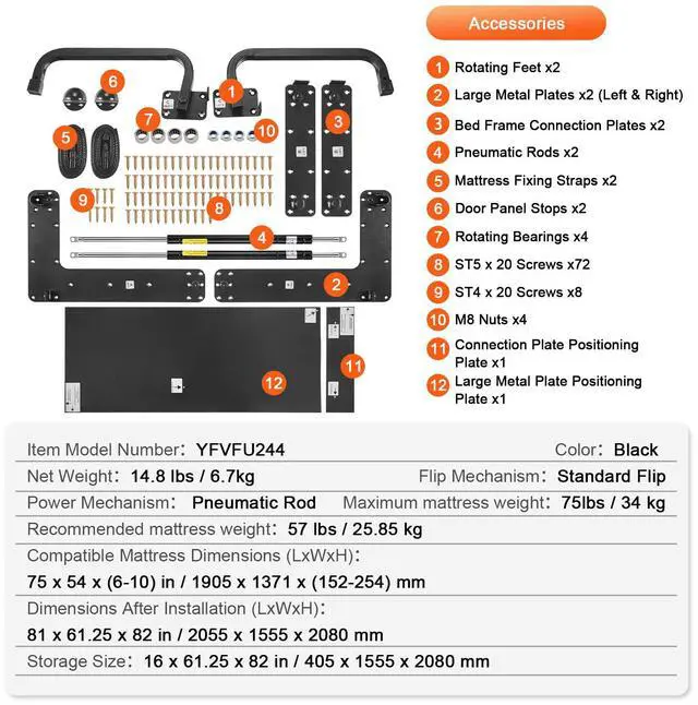 Storage Size: 16x61.25x82 in / 405x1555x2080 mm,Dimensions After Installation (LxWxH): 81x61.25x82 in / 2055x1555x2080 mm,Item Model Number: YFVFU244,Max Mattress Weight Capacity: 57lbs / 25.85kg,Compatible Mattress Dimensions (LxWxH): 75x54x(6-10) in / 1905x1371x(152-254) mm,Net Weight: 14.8 lbs / 6.7kg