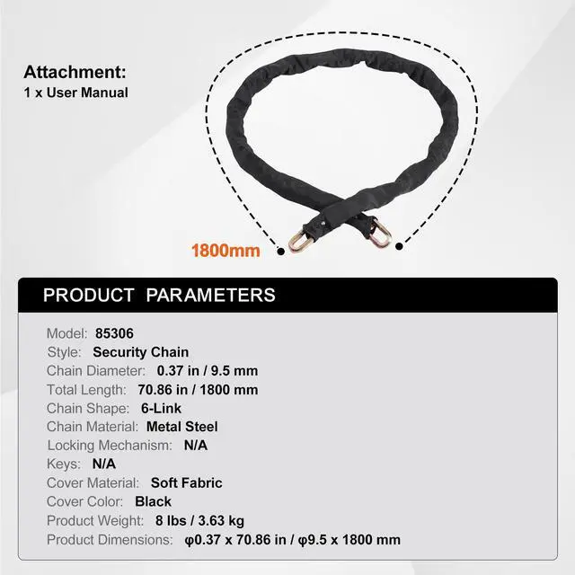 Total Length: 70.86 in / 1800 mm,Cover Color: Black,Locking Mechanism: N/A,Chain Shape: 6-Link,Keys: N/A,Model: 85306,Cover Material: Soft Fabric,Product Weight: 8 lbs / 3.63 kg,Style: Security Chain,Chain Material: Metal Steel,Product Dimensions: 0.37 x 70.86 in / 9.5 x 1800 mm,Chain Diameter: 0.37 in / 9.5 mm