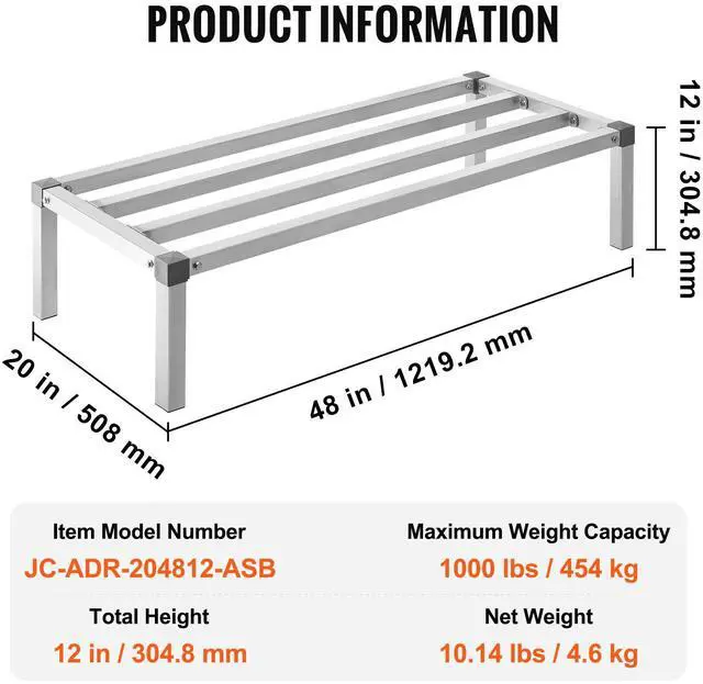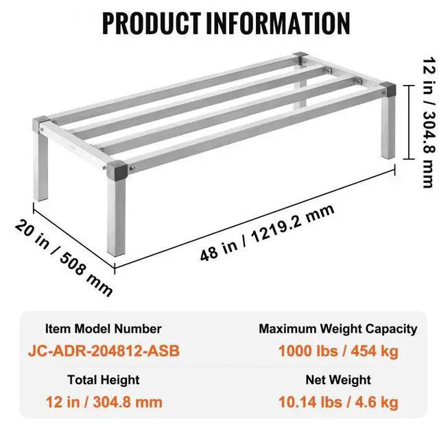 Item Model Number: JC-ADR-204812-ASB,Maximum Weight Capacity: 1000 lbs / 454 kg,Net Weight: 10.14 lbs / 4.6 kg (Including All Accessories),Total Height: 12 inches / 304.8 mm,Product Size: 48 x 20 x 12 inches / 1219.2 x 508 x 304.8 mm