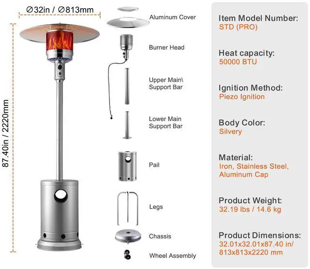 Ignition Method: Piezoelectric Ignition,Item Model Number: STD (PRO),Heat capacity: 50000 BTU,Product Weight: 32.19 lbs / 14.6 kg,Material: Iron, Stainless Steel, Aluminum Cap,Product Dimensions: 32.01x32.01x87.40 in/ 813x813x2220 mm