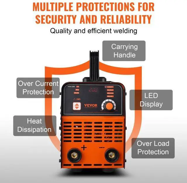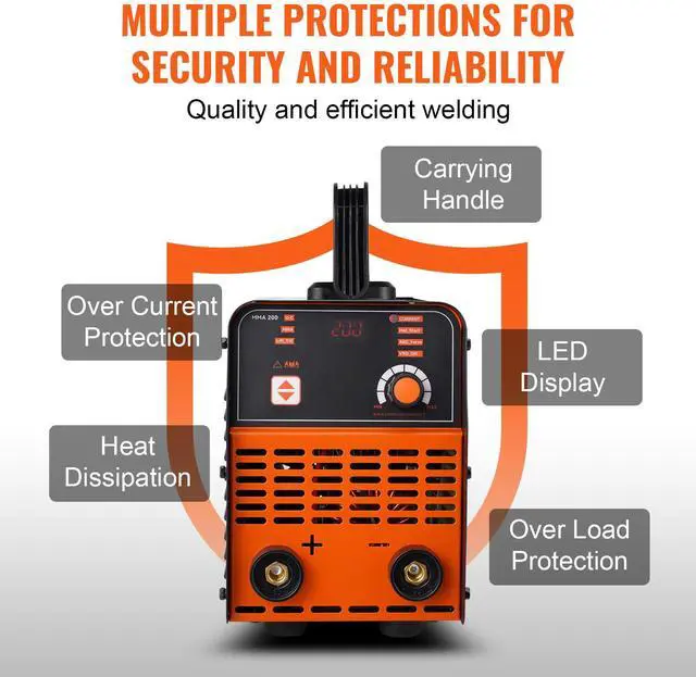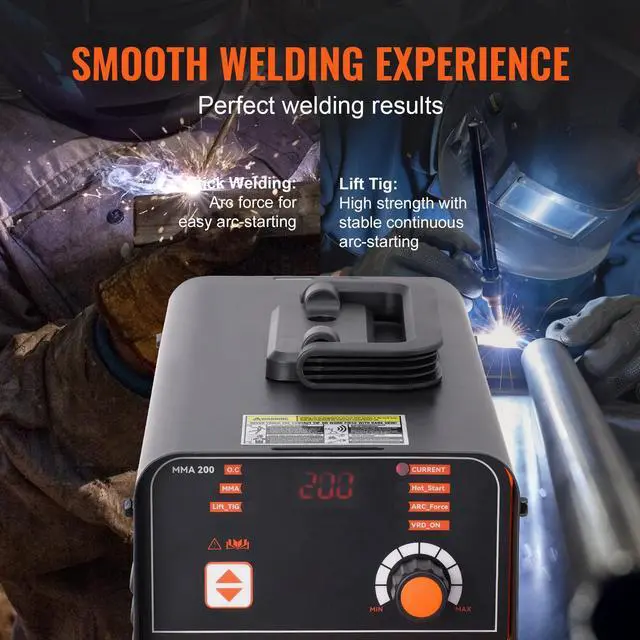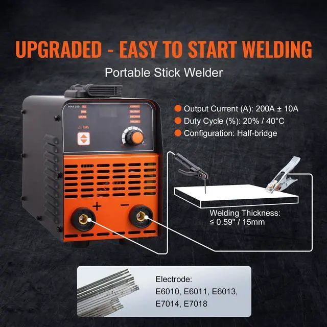 Output Current (A): 120A ± 10A (110V), 160A ± 10A (220V),Welding Thickness: 0.59" / 15mm,Duty Cycle (%): 20% / 40°C,Configuration: Half-bridge,Product Size (L x W x H): 12.2 x 5.5 x 8.66 inches / 310 x 140 x 220 mm,Item Model Number: MMA-200-NA,Rated Current (A): 200A,Output Voltage (V): 24.8V ± 5V (110V), 26.4V ± 5V (220V),No Load Voltage (V): 62V ± 10V,Net Weight: 10.63 lbs / 4.82 kg