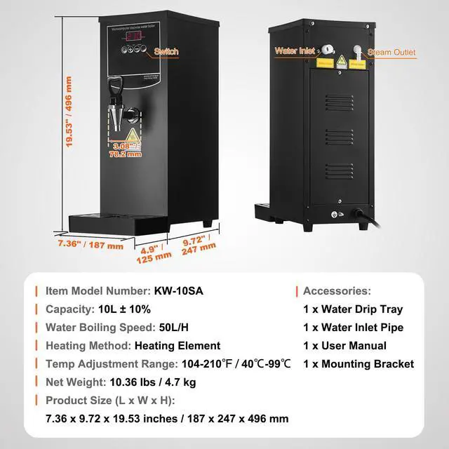Product Size (L x W x H): 7.36 x 9.72 x 19.53 inches / 187 x 247 x 496 mm,Capacity: 10L,Item Model Number: KW-10SA,Temp Adjustment Range: 104-201 / 40-99,Heating Method: Heating Element,Net Weight: 10.36 lbs / 4.7 kg,Water Boiling Speed: 50L/H