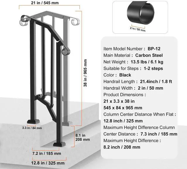 Maximum Height Difference Column Center Distance: 7.3 in / 185 mm,Handrail Width: 2 in / 50 mm,Handrail Length: 21.4 in / 1.8 ft,Column Center Distance When Flat: 12.8 in / 325 mm,Color: Black,Item Model Number: BP-12,Product Dimensions: 60.4 x 3.3 x 39 in / 1535 x 84 x 990 mm,Suitable for Steps: 1-2 steps,Net Weight: 13.5 lbs / 6.1 kg,Maximum Height Difference: 8.2 in / 208 mm,Adjustable Angle: 14° - 50°,Main Material: Carbon Steel