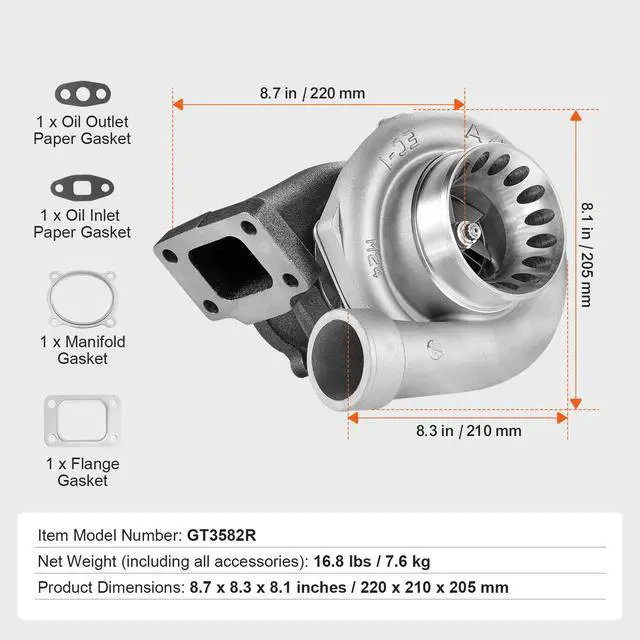 Net Weight (including all accessories): 16.8 lbs / 7.6 kg,Item Model Number: GT3582R,Product Dimensions: 8.7 x 8.3 x 8.1 inches / 220 x 210 x 205 mm