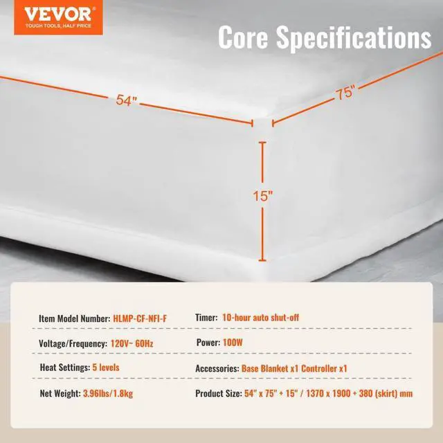 Voltage/Frequency: 120V~ 60Hz,Timer: 10-hour auto shut-off,Item Model Number: HLMP-CF-NFI-F,Heat Settings: 5 levels,Net Weight: 1.8kg,Power: 100W,Product Size: 54" x 75" + 15" / 1370 x 1900 + 380 (skirt) mm