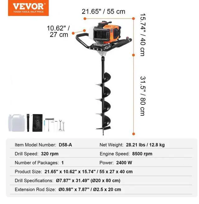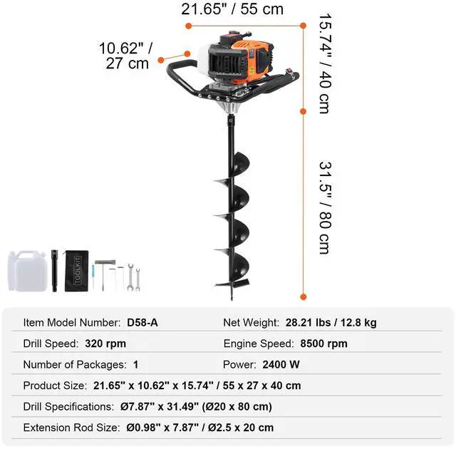 Drill Specifications: Ø7.87" x 31.49" (Ø200 x 800 mm),Extension Rod Size: Ø25 x 200 mm/ ø0.98 x 7.87",Drill Speed: 320 rpm,Engine Speed: 8500rpm,Item Model Number: D58-A,Net Weight: 28.21 lbs / 12.8kg,Power: 2400W,Product Size: 21.65 x 10.62 x 15.74 in / 55 x 27 x 40 cm