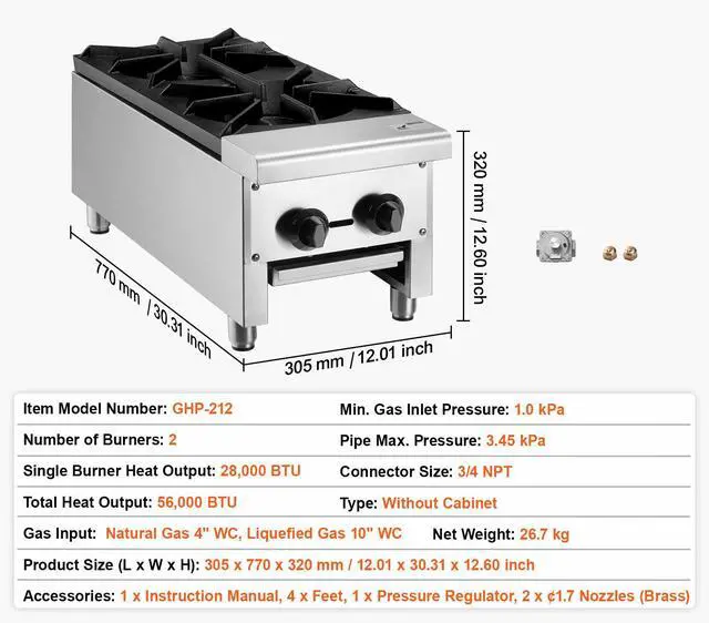 Min. Gas Inlet Pressure: 1.0 kPa,Connector Size: 3/4 NPT,Type: Without Cabinet,Number of Burners: 2,Product Size (L x W x H): 12.01 x 30.31 x 12.60 inch / 305 x 770 x 320 mm,Single Burner Heat Output: 28,000 BTU,Item Model Number: GHP-212,Total Heat Output: 56,000 BTU,Pipe Max. Pressure: 3.45 kPa,Net Weight: 58.86 lbs / 26.7 kg,Gas Input: Natural Gas 4" WC, Liquefied Gas 10" WC