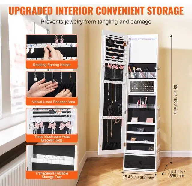 Primary Materials: MDF with PVC Film, Glass, Velvet,Color: White,Item Model Number: PY-2316SS,Product Weight: 41.89 lbs / 19 kg,Mounting Type: Freestanding, 360° Rotatable,Drawers: 1 large bottom drawer,Product Dimensions: 15.35x14.4x63 in / 390x367x1600 mm