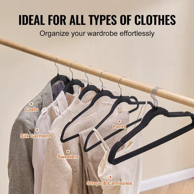 VEVOR Hangers, 11lbs Load-Bearing, 50 Pack Black Velvet Hangers with 360 Degree Swivel Hook & 0.2 in Ultra-Thin Design, Non-Slip Space Saving Hangers, Fit for Silk Garments, Coats, Sweaters & Straps