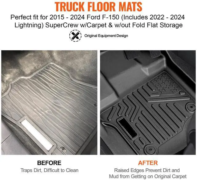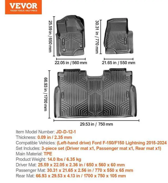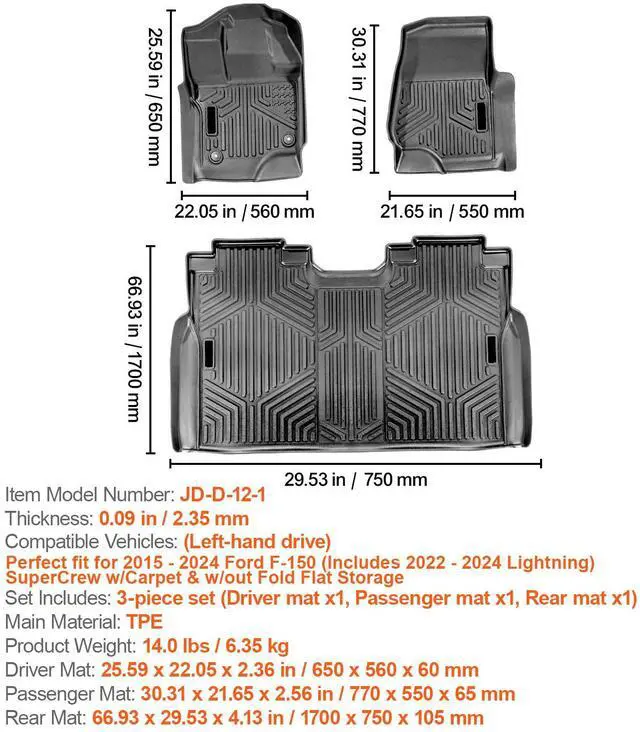 Thickness: 0.09 in / 2.35 mm,Item Model Number: JD-D-12-1,Product Weight: 10.91 lbs / 4.95 kg,Compatible Vehicles: (Left-hand drive) Ford F-150/F150 Lightning 2015-2024,Set Includes: 3-piece set (Driver mat x1, Passenger mat x1, Rear mat x1),Main Material: TPE