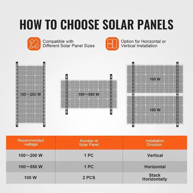 Flexible Adjustment: The VEVOR 50-inch solar panel mount brackets are compatible with 100-550W solar panels. With 0-90° adjustable angle, you can easily set the solar panels to optimal position, maximizing sunlight exposure and enhancing overall energy efficiency.