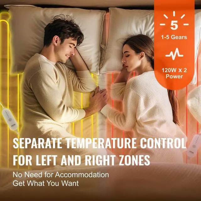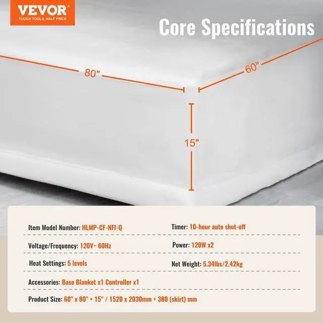 Voltage/Frequency: 120V~ 60Hz,Timer: 10-hour auto shut-off,Item Model Number: HLMP-CF-NFI-Q,Heat Settings: 5 levels,Net Weight: 2.42kg,Power: 120W x2,Product Size: 60" x 80" + 15" / 1520 x 2030mm + 380 (skirt) mm