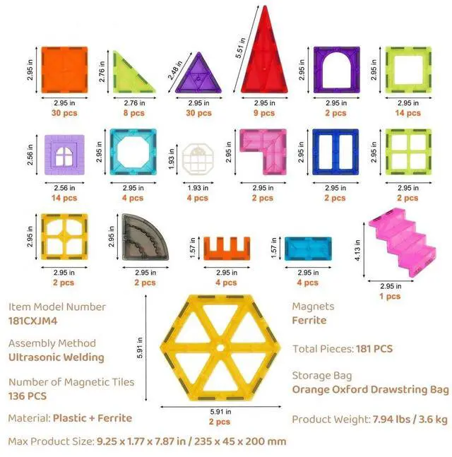 Item Model Number: 181CXJM4,Product Weight: 7.94 lbs/3.6 kg,Max Product Size: 9.25 x 1.77 x 7.87 in/235 x 45 x 200 mm,Number of Magnetic Tiles: 136 PCS,Material: Plastic + Ferrite,Total Pieces: 181 PCS,Magnets: Ferrite,Assembly Method: Ultrasonic Welding,Storage Bag: Orange Oxford Drawstring Bag