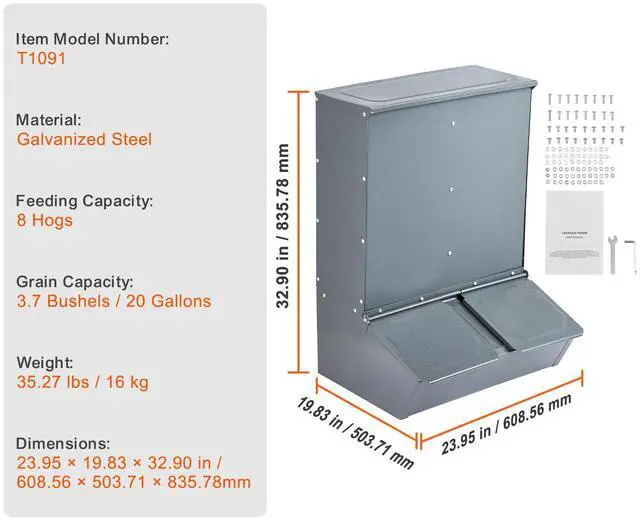 Item Model Number: T1091,Feeding Capacity: 8 Hogs,Dimensions: 600 x 500 x 840mm/23.62 × 19.69 × 33.07 in,Material: Galvanized Steel,Grain Capacity: 3.7 Bushels / 20 Gallons,Weight: 16kg/35.27 lbs