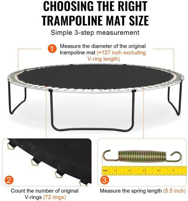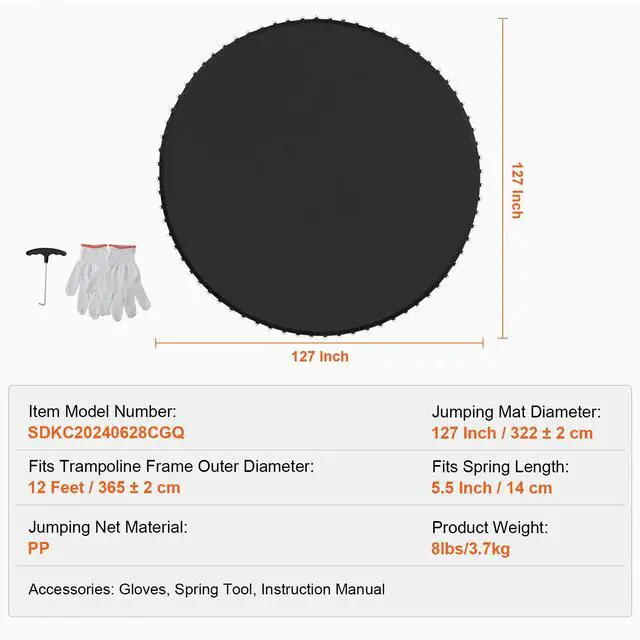 Fits Spring Length: 5.5 inch / 14 cm,Jumping Mat Diameter: 127 inch / 322 cm,Item Model Number: SDKC20240628CGQ,Product Weight: 8 lbs / 3.7 kg,Fits Trampoline Frame Outer Diameter: 12 ft / 365 cm,Jumping Net Material: PP