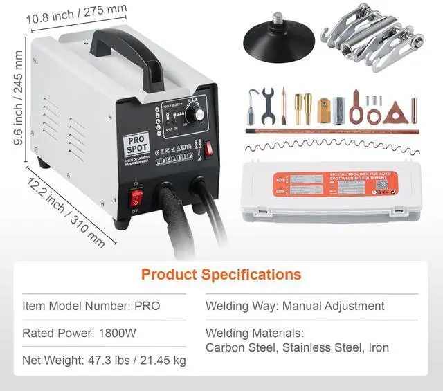 Welding Materials: Carbon Steel, Stainless Steel, Iron,Item Model Number: PRO,Rated Power: 1800W,Product Dimensions: 12.2 x 10.8 x 9.6 inch / 310 x 275 x 245 mm,Net Weight: 43.21 lbs / 19.6 kg,Welding Way: Manual Adjustment